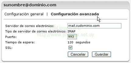 - Luego vaya a las "Configuración avanzada" y verifique que el servidor es el que le asignaron (en este caso "mail.sudominio.com"), que el tipo de servicio es "IMAP", el puerto es "993" y que la opción "SSL" está marcada. Una vez verificado, haga click en el botón "Guardar".