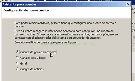 - En el cuadro de diálogo que aparecerá a continuación, verifique que esté seleccionada la opción "Cuenta de correo electrónico" y haga click en el botón "Siguiente".