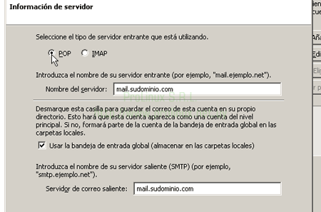 - En "Seleccione el tipo de servidor entrante que está utilizando", seleccione "POP" e ingrese el nombre del servidor que le han asignado en los campos "Nombre del servidor" y "Servidor de correo saliente". Luego, haga click en "Siguiente".