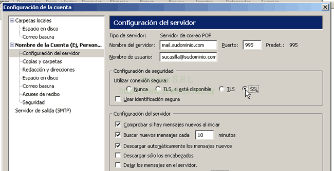 - Al volver al cuadro principal, seleccione "Configuración del servidor" en la lista de la izquierda y en el cuadro "Configuración de seguridad" que aparece a la derecha, seleccione "SSL"