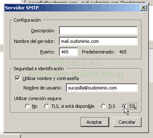 - En el cuadro de diálogo que aparece, dentro de la sección "Seguridad e identificación", marque "Utilizar nombre y contraseña", luego seleccione la opción "SSL", asegurándose de que en la parte superior, el puerto quede con el valor 465. Una vez terminado esto, haga click en el botón "Aceptar" y luego nuevamente "Aceptar" para cerrar la ventana de configuración.