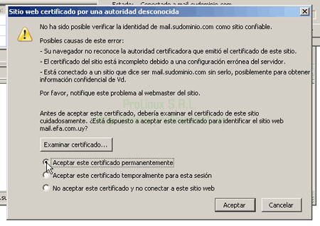 - Una vez que intente enviar o recibir correo, el programa le mostrará un cuadro que le indica que el certificado no es válido. Esto sucede porque el certificado es emitido por una entidad de certificación en la que el programa no confía, pero esto no representa ningún peligro, así que debe seleccionar la opción "Aceptar este certificado permanentemente" y luego hacer click en el botón "Aceptar".